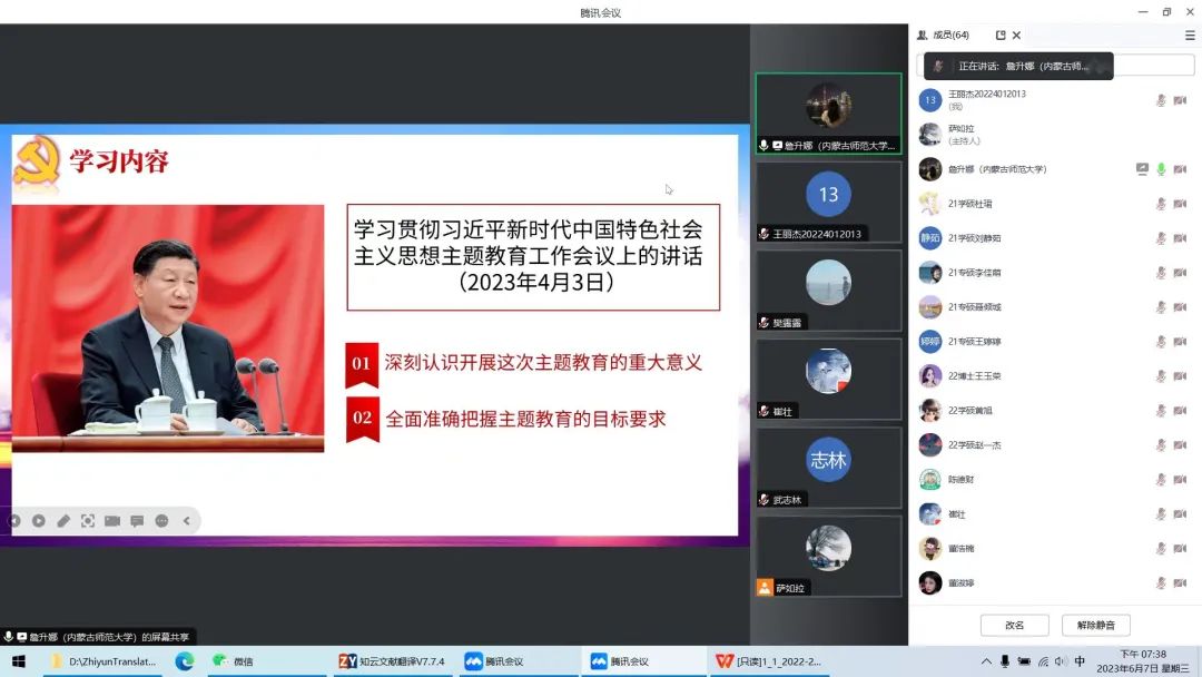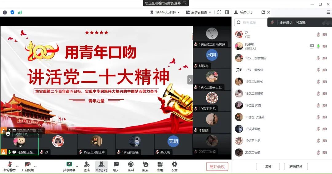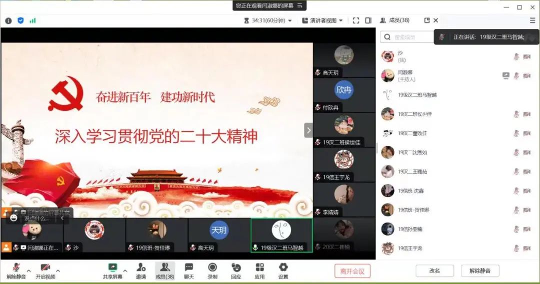 数学科学开元(中国)研究生党支部线上线下结合召开党支部大会。会上研究讨论了预备党员转正事宜。同时由20级学硕詹升娜同学带领学习,提出了要深刻把握主题教育的重大意义以及目标要求,对学习贯彻习近平新时代中国特色社会主义思想主题教育工作会议上的讲话进行了集体学习。