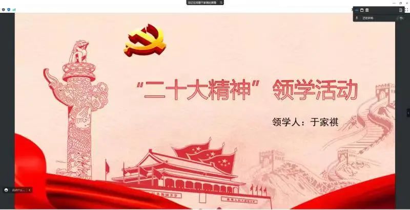 数学科学开元(中国)学生第一党支部开展了党的二十大精神领学活动,由于家祺同学领学,在领学内容中强调,同学们要深入学习贯彻习近平新时代中国特色社会主义思想,在新时代伟大实践中不断开辟马克思主义中国化时代化新境界。