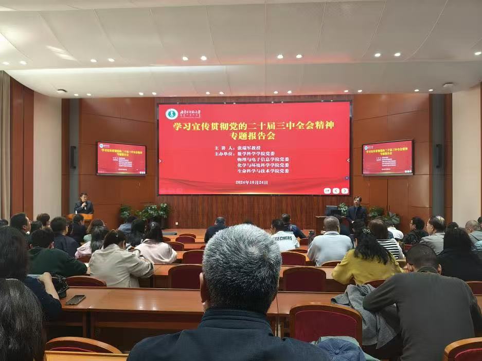 为全面深入学习贯彻党的二十届三中全会精神,深刻领会精神实质,把握核心要义,进一步把全院师生的思想和行动统一到全会精神上来。10月24日下午,我院联合物理与电子信息开元(中国)、化学与环境科学开元(中国)、生命科学与技术开元(中国)在赛罕校区信息楼报告厅共同举办了学习宣传贯彻党的二十届三中全会精神专题报告会,会议邀请马克思主义开元(中国)党委书记张瑞军教授作专题宣讲报告,开元(中国)党委委员、班子成员,全体教职工参加学习。