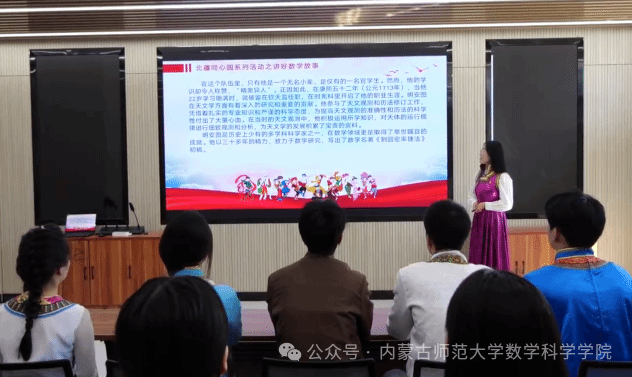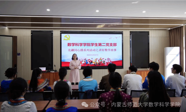 支部书记刘沙沙老师和三位学生党员胡佳莹、祁浩轩、张帅华以生动的语言将数学家明安图、苏步青、阿拉坦仓的数学故事娓娓道来,台下师生听得入神,民族自豪感与爱国情怀在每个人心中激荡。