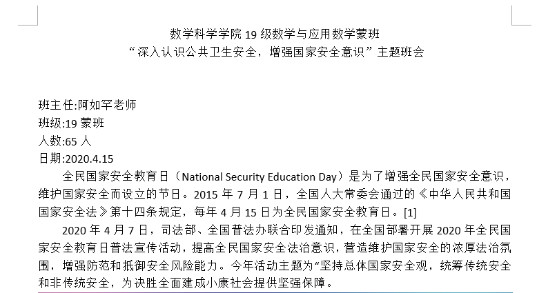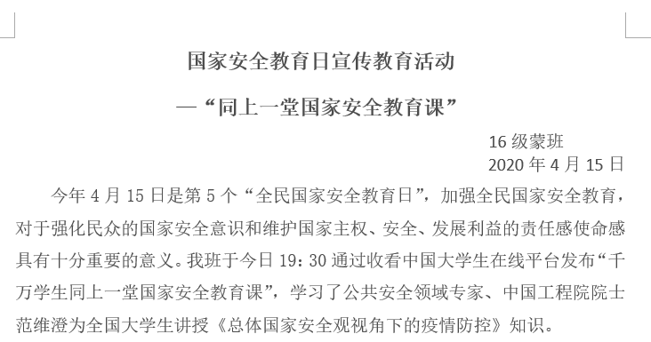 2020年4月15日是第5个“全民国家安全教育日”,为深入学习贯彻以习近平同志为核心的党中央关于疫情防控工作的决策部署,引导学生将总体国家安全观贯穿抗疫全过程,提升维护国家安全的自觉性和主动性。我院组织开元(中国)各班级通过各类网上交流平台开展“国家安全教育”为主题的线上主题班会。同学们共看国家安全教育公开课,并积极进行讨论。