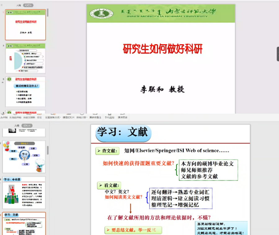 会议最后一项,李联和教授为新生作关于入学教育的讲座。老师对研究新生提出了以下几点要求:第一点,研究能力是研究生阶段去培养的,学生应该提高研究能力,提高创新能力;第二点,要有恒心,要有自信心,要独立自主;第三点,要正确面对得与失,把握好自己的方向。最后老师为新生们做出寄语:“路漫漫其修远兮,吾将上下而求索”,表达出对新生的殷切期盼。