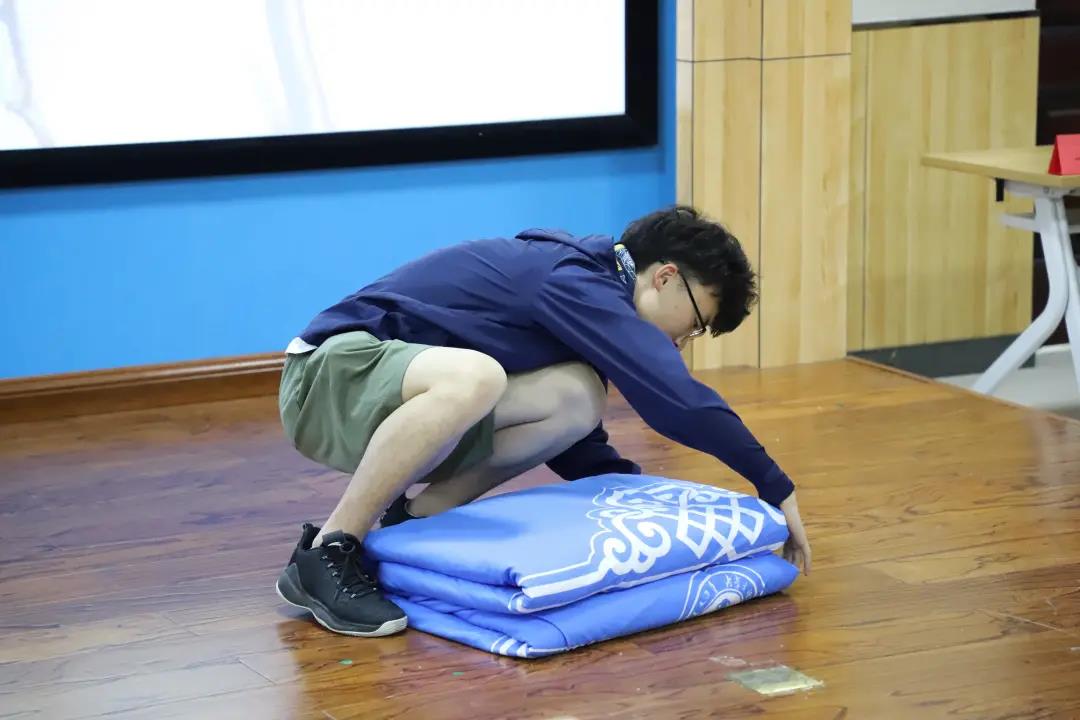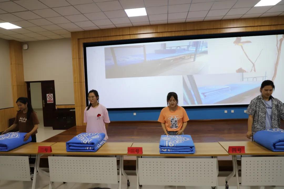 参赛选手在规定时间内将被子按要求叠好,评委老师根据选手们被子的整齐美观程度打分。“一屋不扫,何以扫天下”——把普通的“家务”做好,就不普通。方正整齐的被子表现出数科人认真严谨的生活态度,对生活充满热情。