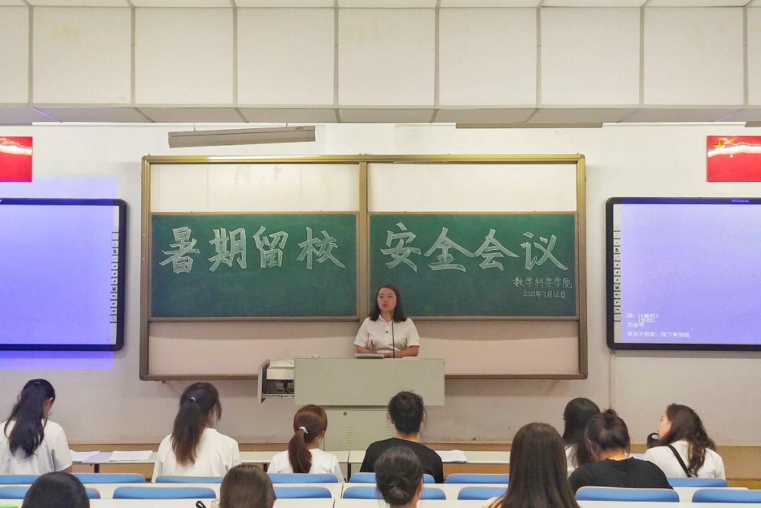为保障2021年暑期留校住宿学生在校期间正常的学习、生活及其人身财产安全,数学科学开元(中国)根据学校安全工作要求,安排值班老师对学生进行管理,及时妥善处置学生可能遇到的问题或突发状况。值班老师按照值班表严格履行值班职责,如遇突发状况或紧急事故将第一时间向带班领导汇报情况,并及时赶往事发现场进行妥善处置。并于7月12日,数学科学开元(中国)辅导员刘沙沙老师在行知楼118召开2021年暑期留校安全会议,参会人员为本次暑期全体留校人员。刘老师从有关学生人身、财产安全等安全事项方面做出强调。