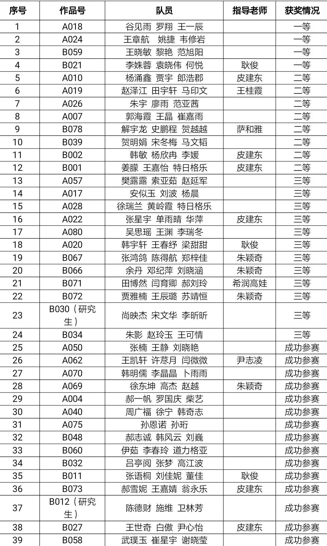 内蒙古师范大学第四届数学建模竞赛于2021年5月28日至5月31日举行,共有83支队伍报名参加,赛后共有47支队伍提交了论文。经过评委组的认真评阅,评出一等奖4组,二等奖8组,三等奖12组,成功参赛奖15组。具体名单如下: