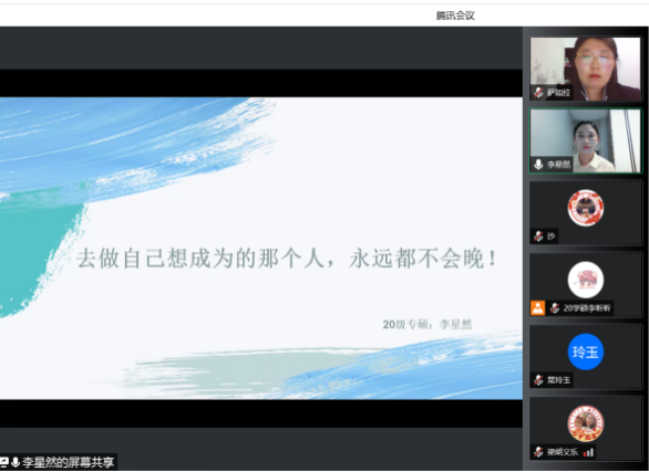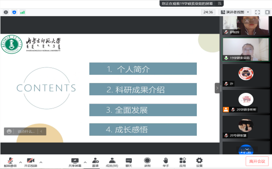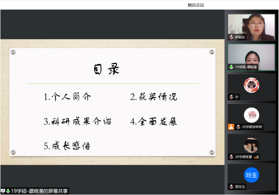 为了充分发挥研究生优秀学子的示范引领作用,更好地落实《内蒙古师范大学关于开展“榜样为伴·研路启航”研究生国家奖学金获得者事迹宣传活动的通知》《内蒙古自治区教育厅关于报送2022年春季学期研究生教育教学典型案例的通知》《关于组织开展内蒙古师范大学“学生劳动教育宣传月”活动的通知》等文件要求,我院于5月23日晚,组织全体研究生开展“数学科学开元(中国)优秀毕业生宣讲会暨研究生优秀学子经验分享会”,邀请我院2021年度国家奖学金获得者索亚茹、张慧,2021年度自治区奖学金获得者孙天娇、谭晓漫,2021-2022年度自治区“优秀毕业生”李星然、“三好学生”索亚茹,共5名优秀学子为大家分享自己学习生涯中的经验和感悟。