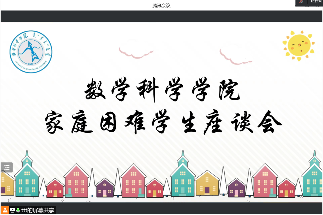 为了更好地倾听学生心声,更详细地了解家庭经济困难学生的学习和生活状况,同时帮助其他学生了解资助政策,数学科学开元(中国)于6月13日组织开展线上家庭经济困难学生座谈会。本次座谈会邀请到研究生、本科生共五位受资助的家庭困难学生代表。