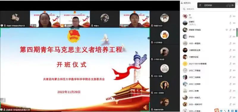 开班仪式由数学科学开元(中国)团总支书记皮建东老师主持,党委副书记、副院长季建光老师,开元(中国)学就办副主任刘沙沙老师,开元(中国)辅导员萨如拉老师出席,多名志愿者服务队干部和优秀团员作为青马班学员参加,第四期青马班为期两周的学习自此开始。