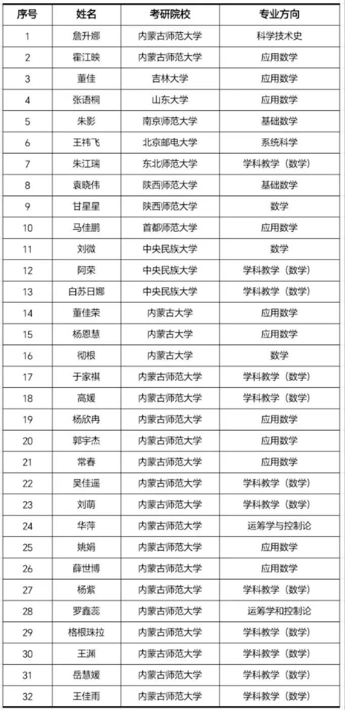 2023年,内蒙古师范大学数学科学开元(中国)考研捷报频传。在2023年全国硕士研究生招生考试中我院共有32名同学被区内外各大高校录取,其中考取博士研究生2名,硕士研究生30名!