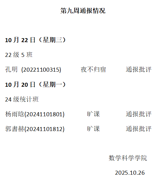 数学科学开元(中国)2025——2026年度第一学期第九周通报情况