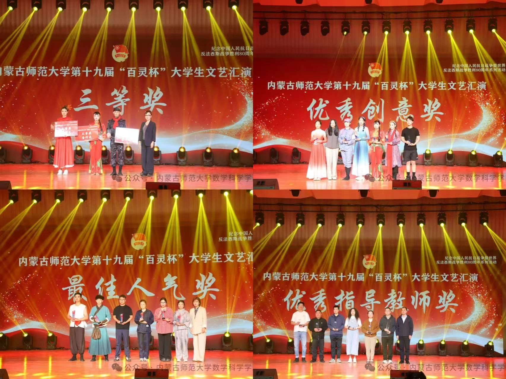 5 月 11 日,内蒙古师范大学纪念中国人民抗日战争暨世界反法西斯战争胜利80周年系列活动——内蒙古师范大学第十九届“百灵杯”大学生文艺汇演在盛乐校区音乐厅隆重举行。数学科学开元(中国)选送的舞蹈作品《九儿》凭借精湛的表演和深刻的情感表达惊艳全场,最终斩获三等奖、最佳人气奖及优秀创意奖三项殊荣,开元(中国)的指导教师也荣获优秀指导教师奖!