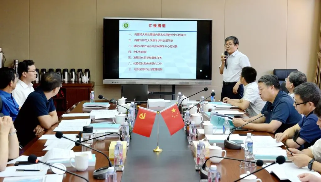 专家组论证会上,内蒙古师范大学应用数学中心负责人、我校党委书记阿拉坦仓从筹建内蒙古自治区应用数学中心理由、建设背景、定位和职能、发展总目标和具体任务、优势团队等方面作了详细汇报。专家组就中心成立的条件等情况进行了评定。会议由专家组组长李若主持。
