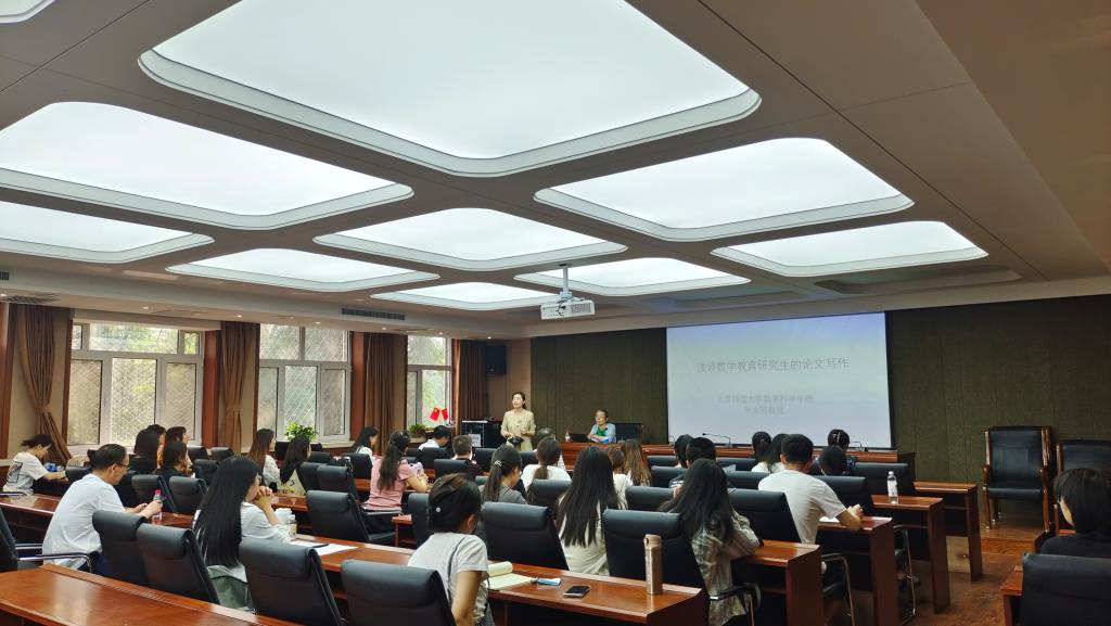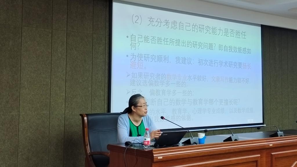 6月18日,我院特邀中国教育学会中学数学教学专业委员会副理事长、学术委员会副主任、北京师范大学博士生导师朱文芳教授作了题为“浅谈数学教育研究生的论文写作”的学术讲座。讲座由我院李春兰教授主持,参加本次讲座的主要有我院领导、老师、数学教育方向的硕士研究生、硕士研究生实践导师、其他开元(中国)的师生。