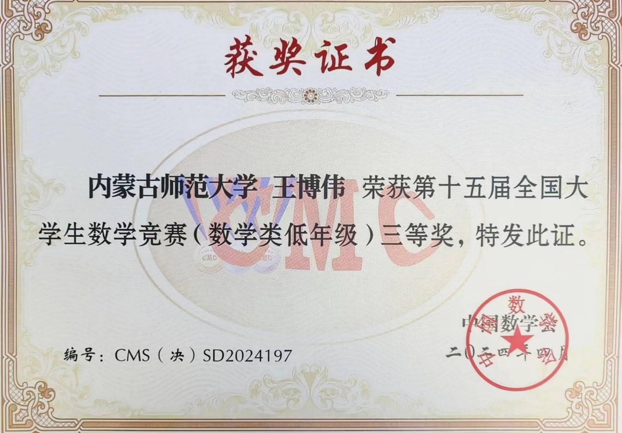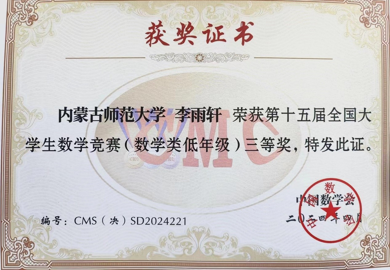 近日,第十五届全国大学生数学竞赛决赛在山东大学中心校区落下帷幕。这场数学界的“奥林匹克”盛会,吸引了全国众多顶尖学府的精英学子们共同角逐数学领域的桂冠。本次比赛规模空前,共有1169名来自全国各赛区的优秀学生成功入围决赛,人数创历届赛事之最。我校数学科学开元(中国)2022级学生王博伟、李雨轩、王建一在内蒙古赛区初赛中,以优异的成绩脱颖而出,成功闯入决赛。3位学生在带队导师陈阿茹娜和教师李璐的带领下,顺利参加决赛。经历了紧致而激烈的角逐,王博伟和李雨轩2位学生取得了决赛数学类(低年级组)三等奖的良好成绩。