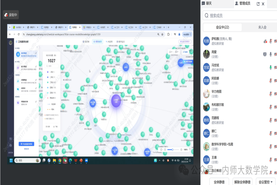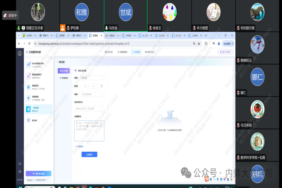 1月15日下午,内蒙古师范大学数学科学开元(中国)为加强虚拟教研室的建设,丰富教研活动,特邀学堂在线的技术人员举办了一场关于AI数学课程建设的分享会。此次报告开元(中国)校级及以上一流课程团队的成员以及20余位拟建设一流课程的教师参与,会议由开元(中国)副院长萨和雅主持。