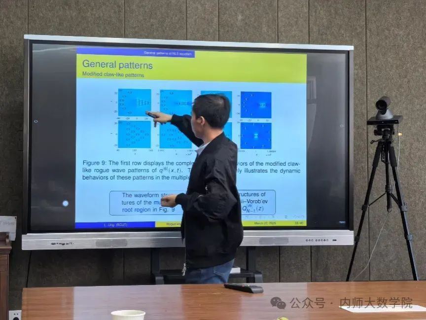 凌教授在报告中详细介绍了非线性薛定谔方程的怪波模式分类问题、分类方法及团队选择Darboux变换来推导怪波模式的思路、关键点、关键点的处理方法、已取得的结果及扩展到其他可积模型的普适性问题。与会师生对报告内容及所提开发问题,进行了热烈讨论与展望。本次交流学习对于开元(中国)学科发展、研究生培养质量的进一步提高有很好的促进作用。