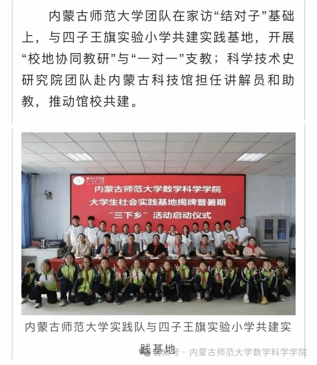 9月17日,内蒙古教育厅发布了“青春聚力两大件事”系列报道,主题为“在守护北疆安全中彰显青年的使命与担当”,我院三下乡实践队与四子王旗实验小学共建实践基地的活动也被纳入其中。