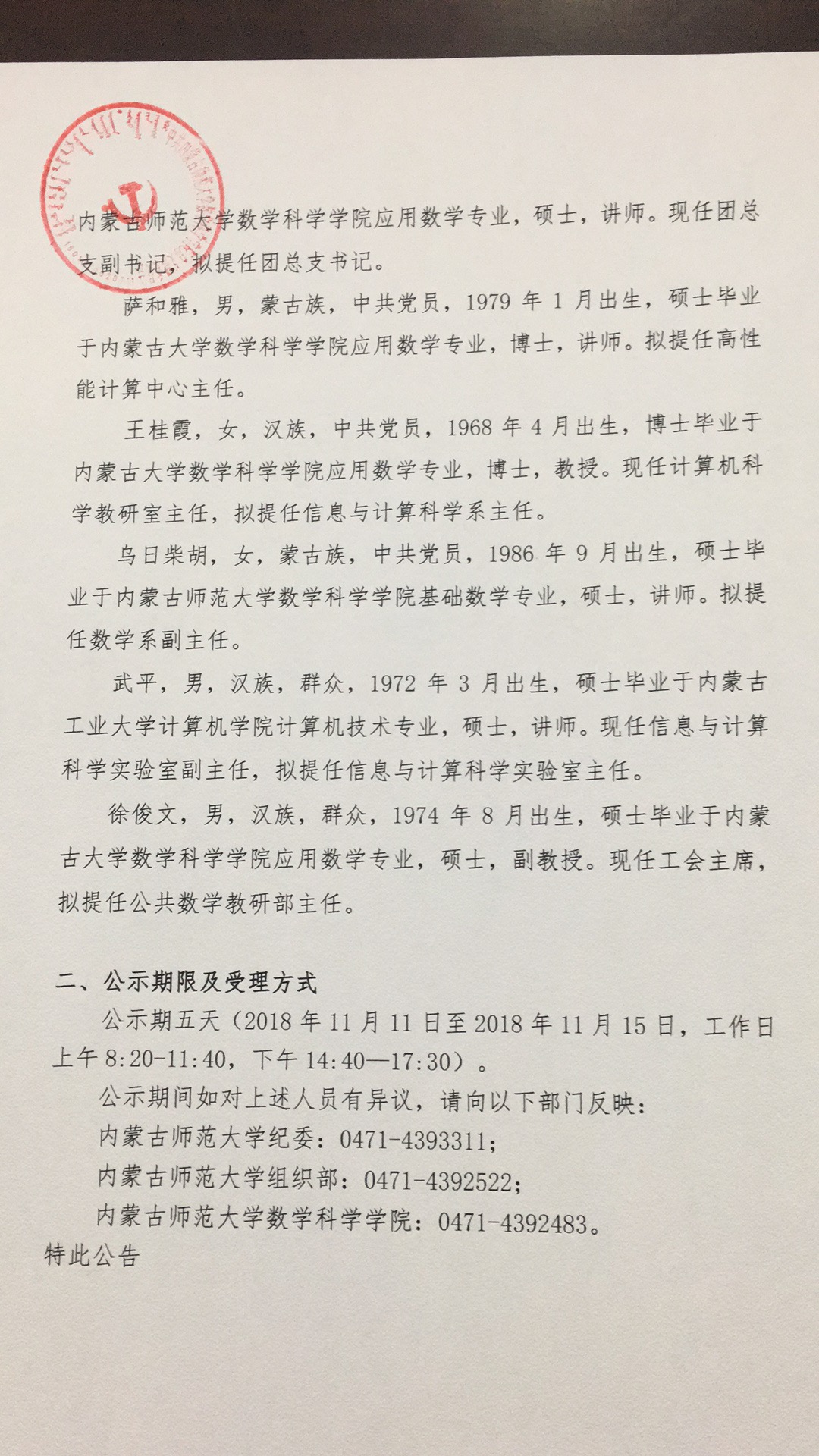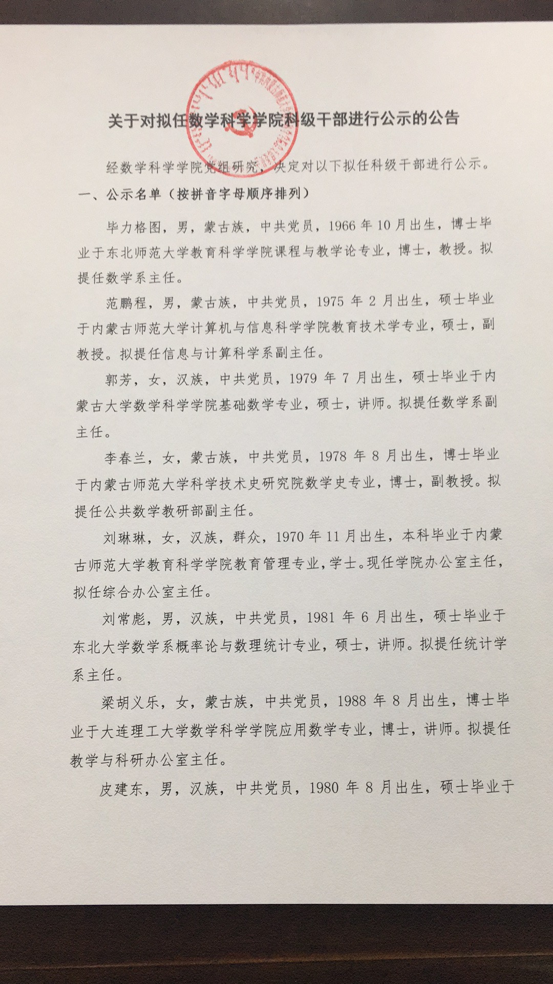 关于对拟任数学科学开元(中国)科级干部进行公示的公告