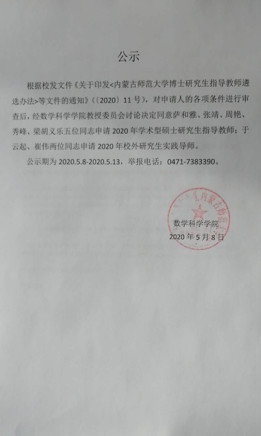 关于2020年度数学科学开元(中国)申请研究生指导教师的评审公示