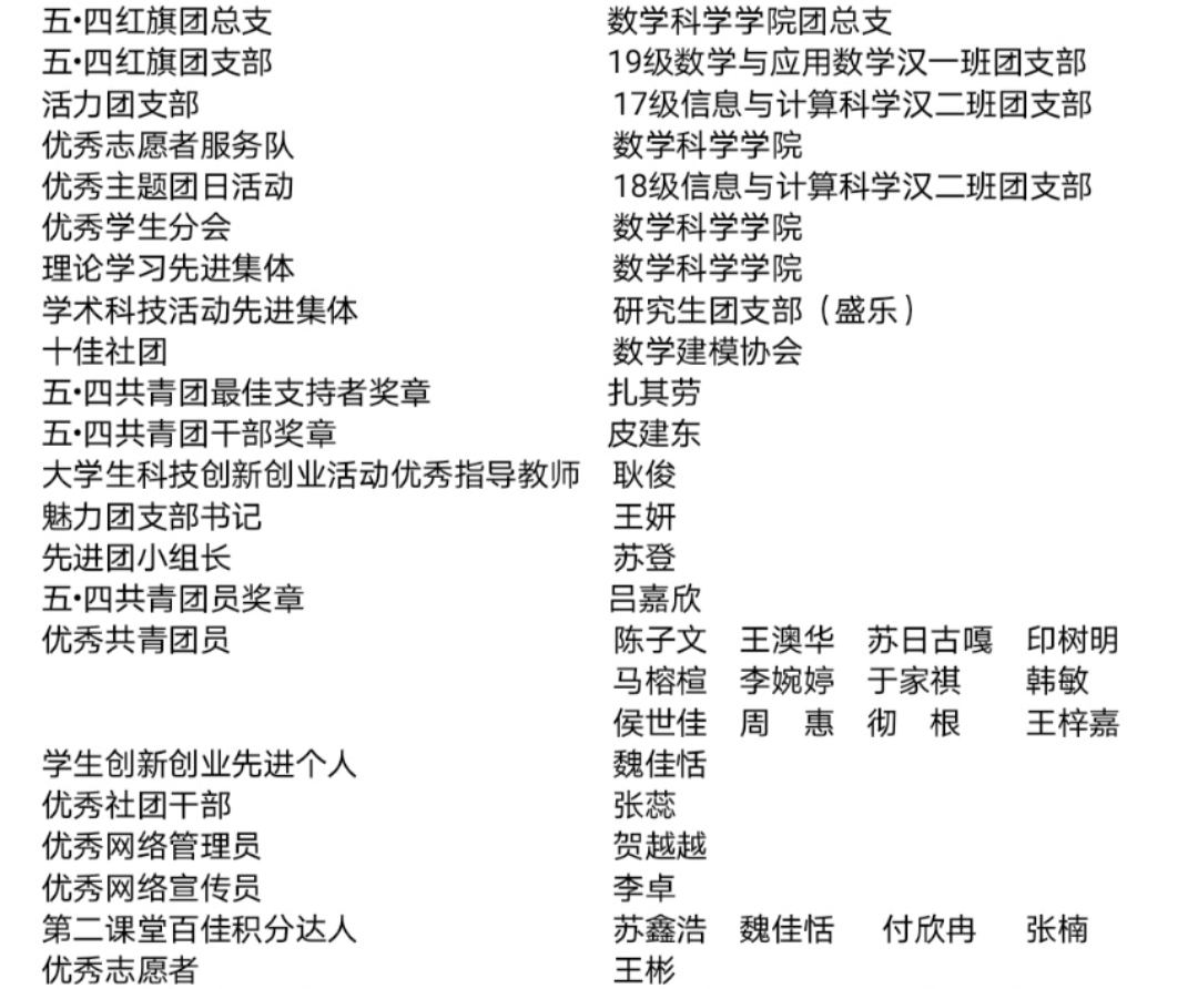根据《关于开展2020年度“五·四”系列表彰的通知》的文件要求,在相关集体和个人自愿申报的基础上,经过党政联席会议研究,确定推荐以下集体和个人申报“五·四系列表彰”。