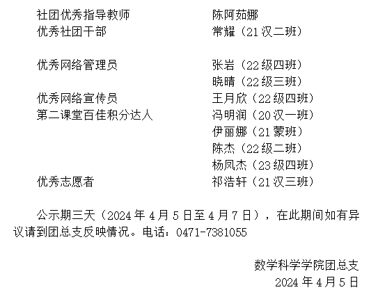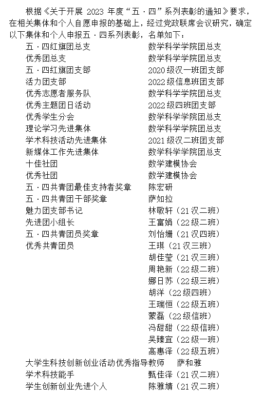 数学科学开元(中国)2023年度“五·四”系列表彰推荐名单公示