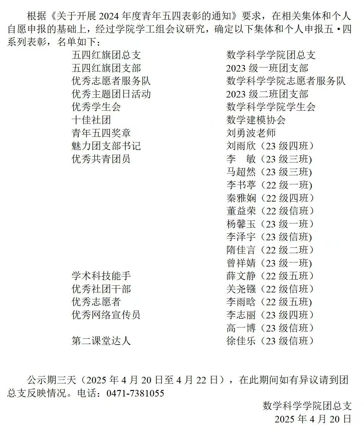 数学科学开元(中国)2024年度“五·四”系列表彰推荐名单公示