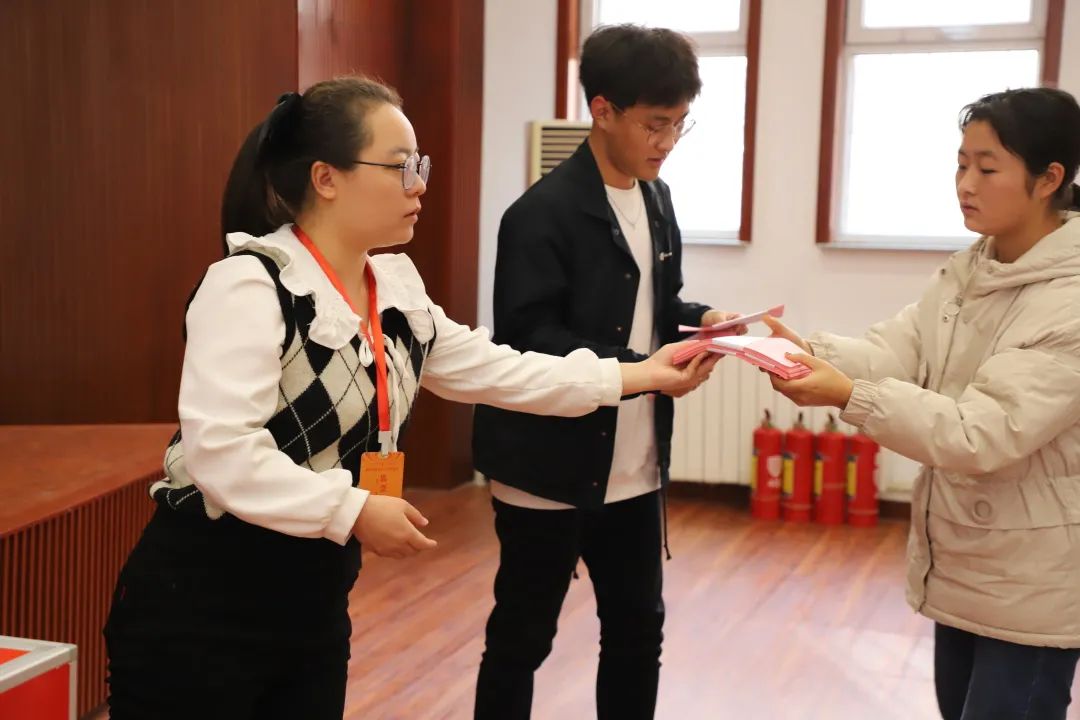 工作人员为班级代表发放选票
